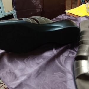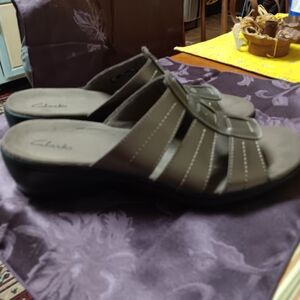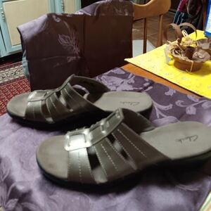 Clark's silver slip on 3 straps leather uppers 2in heel size 10