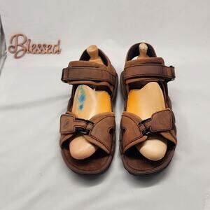 HELLO ,THESE CLARKS STYLE AIR TREX SANDALS ARE VERY CLEAN INSIDE AND OUT , CHECK PICTURES ๐ธ , THEY WERE ENGINEERED IN GERMANY FOR CLARKS ,VERY WELL MADE THE BOTTOM RUBBER SOLES ARE LIKE A THIVK CREATOR LOOKING TIRE , MATERIAL, THATS NEVER GOING TO FINISH LOL. THE COLORWAY IS BROWN. THE SOLES ARE BLACK , AND LOOK LIKE THEY HAVE DIRT ,BUT ITS PART OF THE SOLE ,TRIED CLEANING IT. THEY FEATURE TWO ADJUSTABLE VELCRO STRAPS , THE UNDER SIDE OF THE STRAPS ARE PADDED FOR EXTRA COMFORT. THEY COME WITH A CUSHIONED FOOTBED SUEDE, THATS BEEN CLEANED AND DISINFECTED FOR YOU , THANKS FOR STOPPING BY MY CLOSET AND LOOKING AROUND.