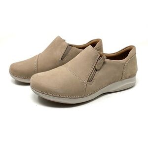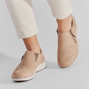 CLARKS APPLEY ZIP LOAFER IN SAND NUBUCK WIDE