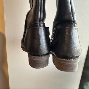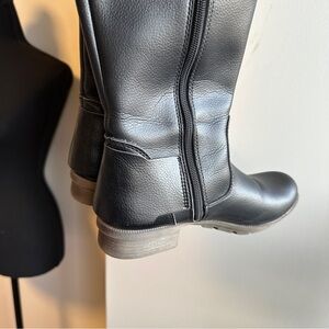 Sleek black leather riding boots with a side zipper. Perfect for a stylish look.