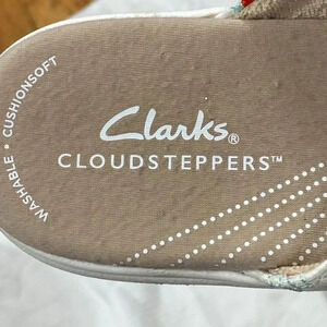CLARKS CLOUDSTEPPERS WO SIZE 8.5 SLIP ON MULES WHITE WITH BLUE DAISIES CLEAN