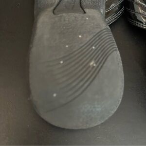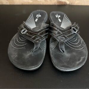 These ladies black patent Clarks cloudsteppers slip on flip-flops are a size 10, and are in good preowned condition. Please see photos as they are part of the description and show the wear and condition of the shoes. Size tag is hard to read, but these match up to a woman’s size 10. Questions? Leave a comment below!