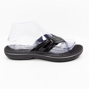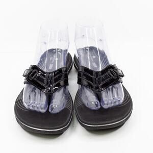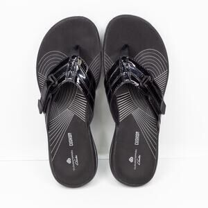 CLARKS Cloudsteppers Sea Breeze Patent Thong Sandals Flip Flops Black Shiny Sz 7
