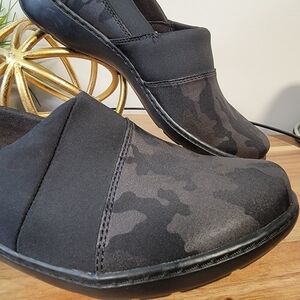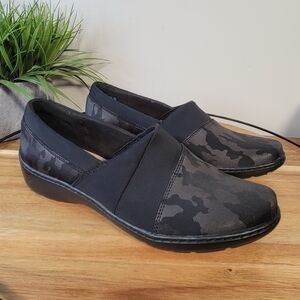 CLARKS Cora Heather Black Interest Camo Slip On Loafers Leather Size 9