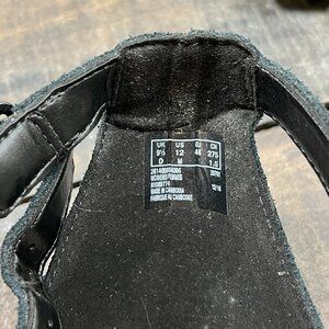 Up for sale is one(1) pair of CLARKS Gladiator Black Strappy Sandal Wedge Women's 12 Heel Suede Fringe Abigail