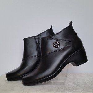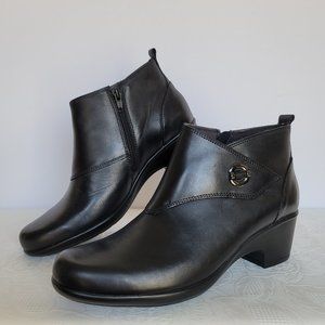 BRAND NEW WITH BOX. Black color. The Malia ankle bootie styled with a layered toggled design for modern appeal. Crafted from full grain leather with a side zipper for easy on/off. Features a fabric lining and sturdy shank for stability and comfort.