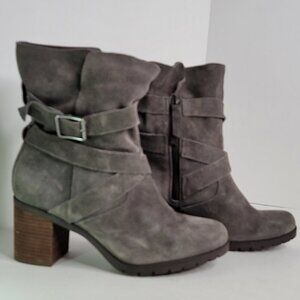 Wrap yourself in moto-inspired style with the Malvet Doris boot! The Malvet Doris is part of the Clarks® Artisan collection. Premium suede uppers. Strap and buckle detail. Side zipper for easy access. Soft textile linings. Comfortable Cushion Plus™ with OrthoLite® footbed. Stacked block heel. Lugged rubber outsole. Imported.