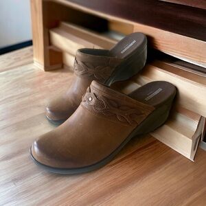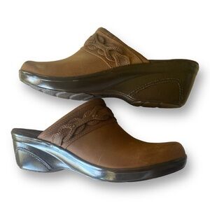 CLARKS Marion Coreen DARK TAN Wedge Mules Clog 2 1/2” Size 11 NW…Minimalist