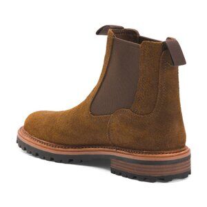 stacked block heel, lug sole, stretch side panels, pull on loops, oiled finish