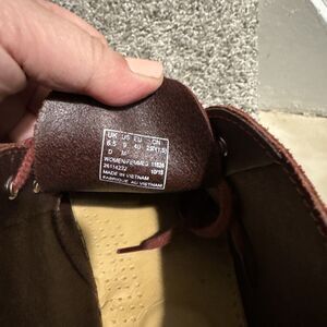 The product is a pair of Women's Suede Leather 2 eye Lace Up Chukka Desert Shoes Boots by Clarks Originals in size 6.5 UK (9 US). These ankle boots feature an almond toe shape, lace-up closure, and a flat heel under 1 inch. The red color and leather lining add to the stylish and comfortable design of the boots, making them perfect for travel, casual outings, or business use. The outsole and insole are both leather, providing durability and quality for the wearer. Perfect for those looking for a versatile and trendy option for their footwear collection.