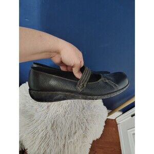 These Clarks Women's Active Air leather Mary Jane flats in size 8 offer comfort and support for casual, work, and walking occasions. Featuring a round toe, elastic strap closure, and arch support, these black flats have a rubber outsole and leather upper material. The Mary Jane style with a solid pattern and sporty theme makes them a versatile choice for everyday wear. With a foam insole and fabric lining, these Clarks Active Air flats provide a comfortable fit for all-day wear.