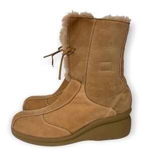 CLARKS brown Nubuck Leather Wedge Fur Lined Snow Winter Boots Foldover Size 8.5