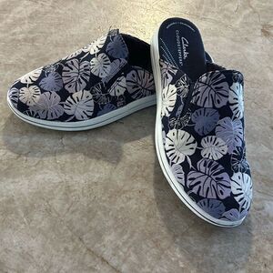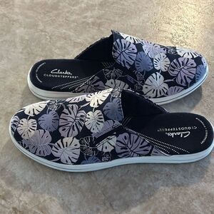 Fun pair of Clarks cloud steppers slip on mules. Washable with cushion air insoles.