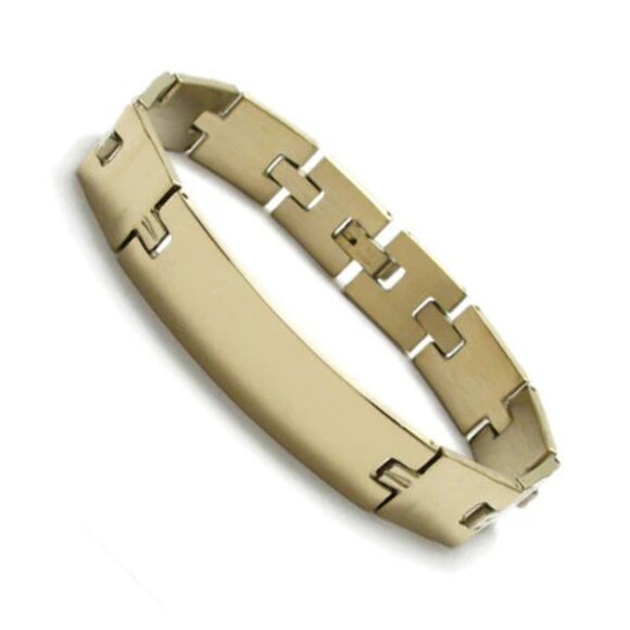 Timeless bracelet style in stainless steel with square links and an engravable plate. A basic for any jewelry collection. Available in two colors, ion plated gold and natural stainless steel.