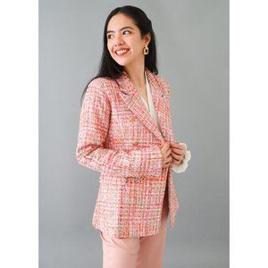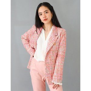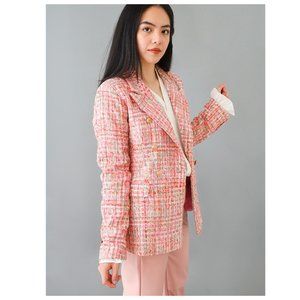 A modern reinterpretation of the classic blazer. This double-breasted tweed blazer in a feminine pink hue features notch lapels, flap pockets, and etched buttons that elevate this retro-chic blazer. This blazer can be worn both formally and casually.