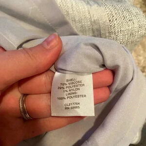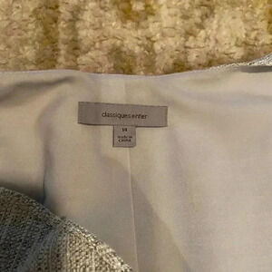 Size 14. Classiques Entrier v neck ruffle formal gray dress. Woven colors of grays with hints of white, silver, and black. Ruffle detail on right side of v neck. Incredibly classy. Hidden left side zipper. Loops on side for a small belt. Excellent used condition. Reasonable offers welcome!
