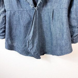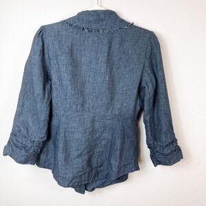 CLASSIQUES ENTIER Blue Blazer with Fringe Size Small. This is a linen blazer that almost looks like blue jean material. This piece has to clasps at the front for closure. This has rouched long sleeve hem with a raw hem detailing around collar and at the front of this piece. This is in excellent pre owned condition with no flaws.