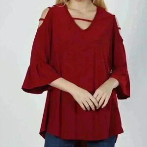 Classy wine colored top featuring cold shoulder details and sassy neckline. Pair with jeans or leggings for a complete look.
