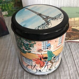 CLAUDE MONET Water Lillys painting France themed large nylon tote bag , Post card from the Monet museum & the Monet Museum guidebook called Giverny. Tote bag is large with Claude Monets Water Lilly painting on the front, double handles, large interior with top zipper & wide bottom base. also large front pocket. Back is solid black. 1 post card was purchased in France at the Claude Monet home & museum in Giverny. This is The Explorer painting he did. Other vintage postcard, most old, black & white, French themed. Guidebook is from the museum & in color. Tin Paris themed round with whimsical French designs. Napoleon collectors book by Keith Ashley.