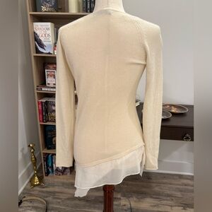 Elegant cream V-neck sweater featuring a stylish sheer hem. Perfect for layering and adding a touch of sophistication to any outfit.
