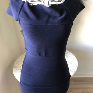 The perfect dress Navy Blue for a night out, this bandage silhouette hugs the body just right to deliver a sultry aesthetic. Complete with chest detail and an off-shoulder neckline. Back zipper closure.