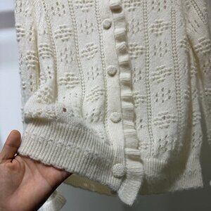 In a soft, baby alpaca-wool blend, the ‘50s-inspired Claudie Cardigan features a high neck, full-length sleeves, a fitted silhouette, and an intricate allover pointelle design. Ruffles adorn the neckline, center front placket, and sleeve cuffs, while floral crochet-covered buttons extend down the front.