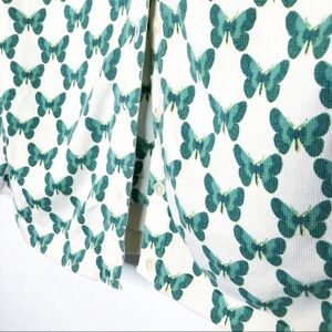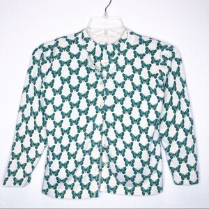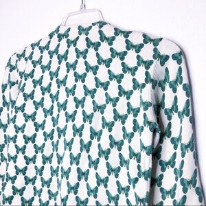 Beautiful button cardigan with acrylic buttons. Long sleeves. Butterfly motif. Tight knit. Colors are a cream background and shades of green for the pattern. Made in France. Size small