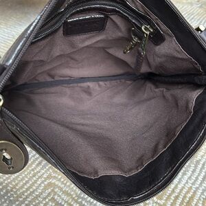 CLAVA leather turnlock cross body bag. Great preowned condition with slight wear on one corner as seen in pictures. Zip top. Adjustable strap. 12.5 x 13 x 0.5 inches. Measurements are approximate laying flat in pictures. Please see all nine photos.