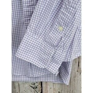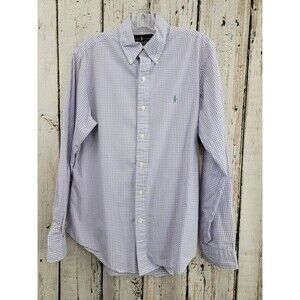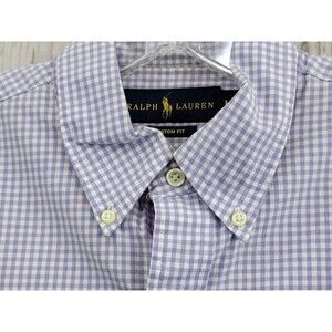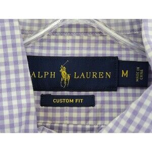 Men's medium Ralph Lauren dress shirtButton down frontButton cuffsWhite and purple check patterncustom fitGreat preowned condition; no stains, tears or odors.