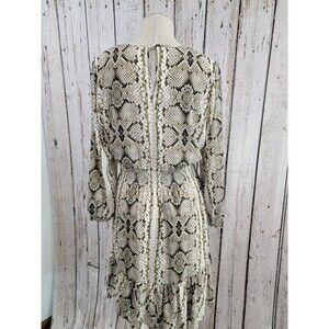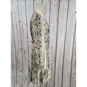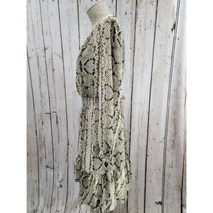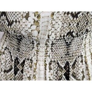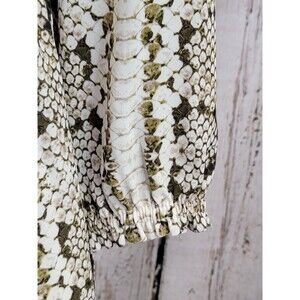 Green / cream snake print Sheer long sleeves with elastic cuffs Round neckline Lined Machine wash cold Elastic smocking at waist Ruffles at hemGreat preowned condition; no stains, tears or odors.