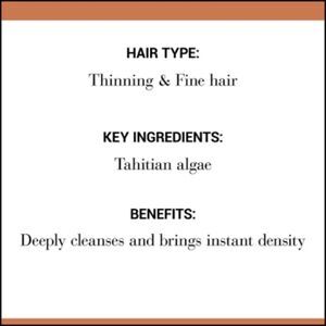Its innovative formula, composed with 95% natural-origin ingredients, is concentrated with pure rassoul clay. Rich in minerals, it gently absorbs impurities that suffocate the scalp and immediately brings fullness and body to the roots. It is combined with a Tahitian algae known for its densifying and invigorating properties.