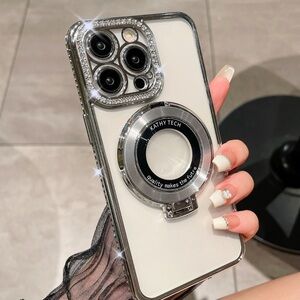 CLEAR SILVER RHINESTONE BLING IPHONE 15PRO PHONECASE WITH KICKSTAND