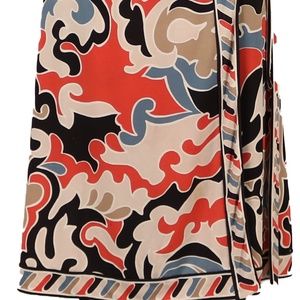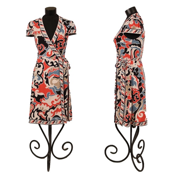 This particular multicolor wrap dress is difficult to find! Red, white, black, gray and beige designs, with contrasting stripes. Excellent used condition.
