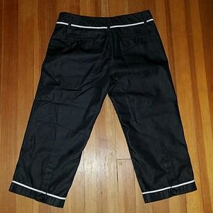 Black capris with white stripe detail. Size 6 EUC. Real back pockets.
