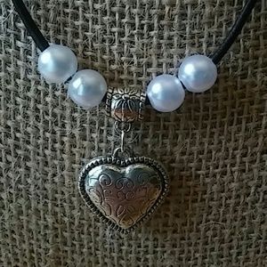 20" Handmade Necklace, black leather cord, faux pearls, tibetan silver heart charm & toggle closure. Sorry No Shipping Discount. Can be shortened if desired!