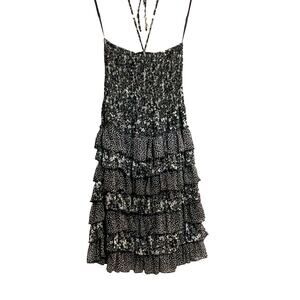 Embrace the boho chic with this CZ Cover Ups smocked layered ruffles dress in a medium size. The dress is an ideal pick for those who love a mix of peasant, beach, and bohemian themes. The black color and fit-and-flare style make it perfect for a variety of occasions, from casual outings to cocktail parties. The dress features a tie-around neckline, which adds a touch of whimsy to the piece. Made from 100% cotton, it is machine washable for easy care. The pullover closure ensures that it's effortless to wear. With its versatile accents, like ruffles and layered design, this dress is a fashionable addition to any wardrobe.
