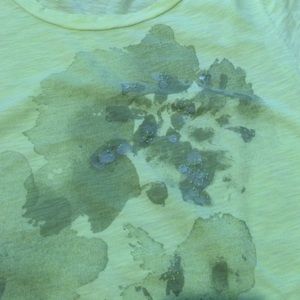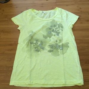 100%cotton slub jersey cap sleeve tee in chartreuse color. Grey watercolor print on front with clear sparkles.length 25", 1/2 chest 18"