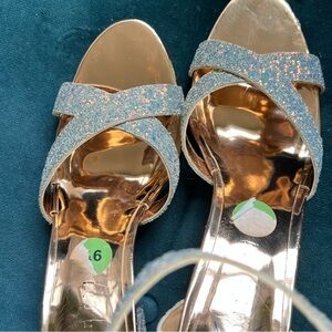 Blue and Gold crystal Strappy ankle strap heels. Crisscross straps across toes. Block high heels.size 9.5 excellent condition