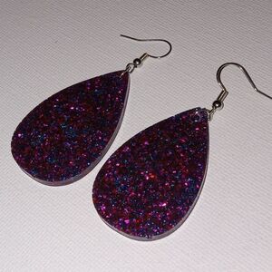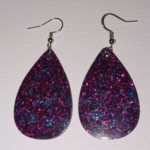 Magenta and blue resin teardrop earrings with silver plated and hypoallergenic metal and ear wires