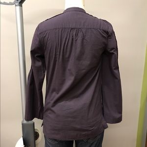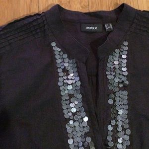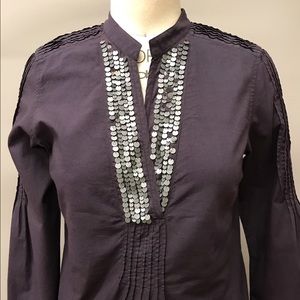 100% cotton mandarin collar pop over tunic with metal sequins on the front placket. Shoulders and sleeves have 1/4" wide pin tucks as well as on the front. Side slits. Great condition. Charcoal color with antique nickel sequences.