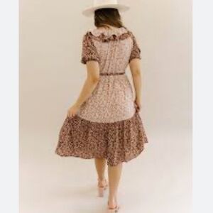 Neutral Fall floral print ruffle dress with contrasting floral prints. Puff sleeves, double ruffle collar