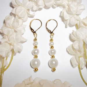 This small dainty pair of beaded earrings are sure to delight. NWT & handmade by me. These modern beauties are made with white acrylic faux freshwater pearls in graduated sizes. They also have gold toned costume jewelry beads that dangle & drop from lever backs for pierced ears. Measure 1 7/8 inches tall & not quite 3/8 inches wide. Each single earring weighs 1.0 gram. Very lightweight! Pearls are appropriate for any occasion - weddings, work, girls night out, or just a quiet day at home.