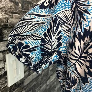 Bow in front. Tropical print with leopard hem with ribbon. Has 2 slit pockets on side. This company makes scrub tops, however this is way to cute for that. Can be worn on vacation, to the beach, a festival or fair.