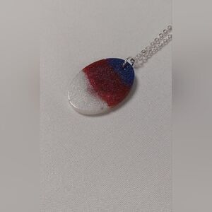 CLEARANCE Red white blue resin oval necklace with silver toned 11 inch chain