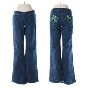 30" waist, 29" inseam, low rise. Ombre green graphic embroidery on pockets, little bit of stretch.