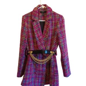 Brighten your look with this vibrant feminine tweed doubled breasted coat. With matching buttons that blend amazingly well into the patterned material. The coat is a size medium and is in very good condition. Fully lined and in good condition. It does have belt loops for a belt that I do not have. I have showed a picture of it with a personal leather belt with a gold chain to give an idea of what types of belts can be worn for a more cinched appearance. This coat is super fun and is Maximalist perfection!