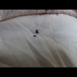 Two small holes on the halter neck. Covered by a sequined ruffle, so it is not visible