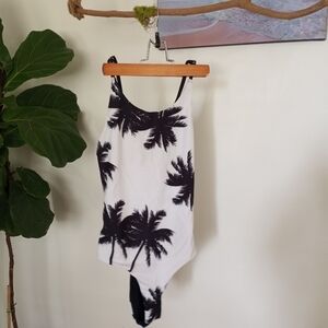 🌴 Gorgeous tropical print in black and white which makes it more contemporary. The back has straps like a corset-style closure. The bottom of the swimsuit is high rise/Brazilian bottom. The back is lined with black fabric so it covers really well. Worn twice. Adjustable straps.