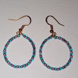 Teal and pink beaded circle earrings with gold plated and hypoallergenic metal and ear wires