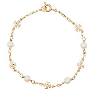 Tory Burch celebrates American style with their ready-to-wear, bags and even jewellery. This Kira pearl bracelet embodies the classic aesthetic of the brand with a delicate gold-tone chain that features double 'T' charm detailing. This piece has global appeal.